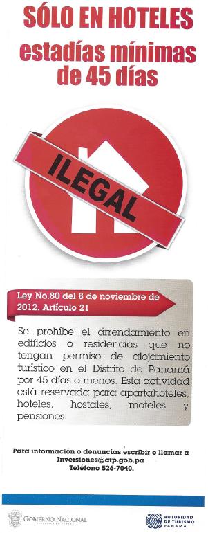 La Directora de Inversiones Turísticas de la ATP, Nadgee Bonilla advirtió que "se tomarán las medidas enérgicas" que establece la ley 80 del 8 de noviembre de 2012, que en su artículo 21 "prohíbe el arrendamiento en edificios o residencias que no tengan permiso de alojamiento turístico en el Distrito de Panamá por 45 días o menos. Esta actividad está reservada para aparthoteles, hoteles, hostales, moteles y pensiones’’.